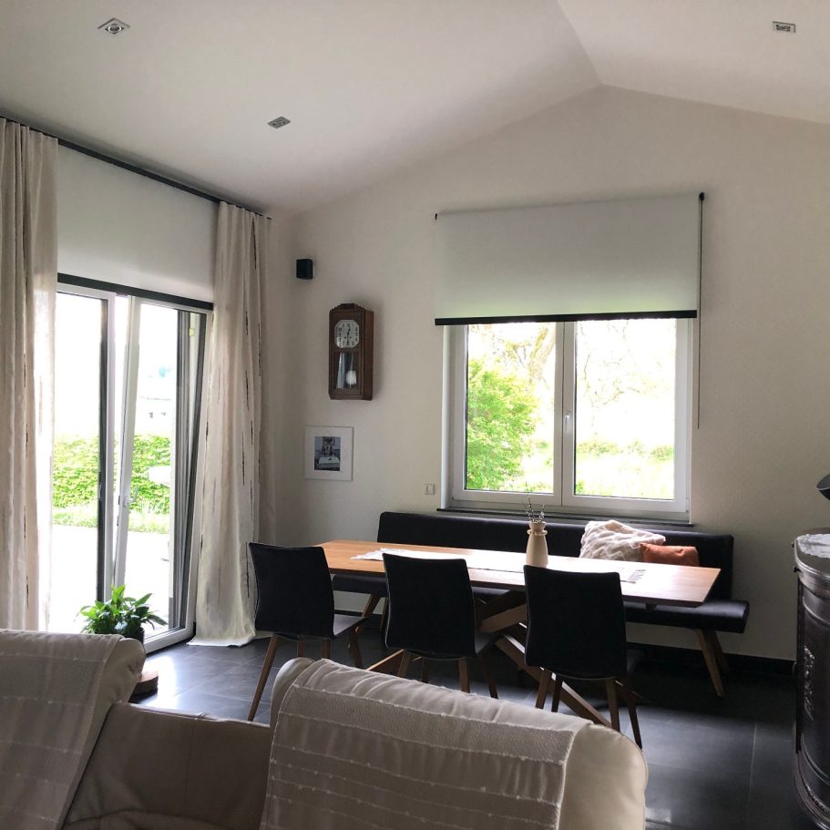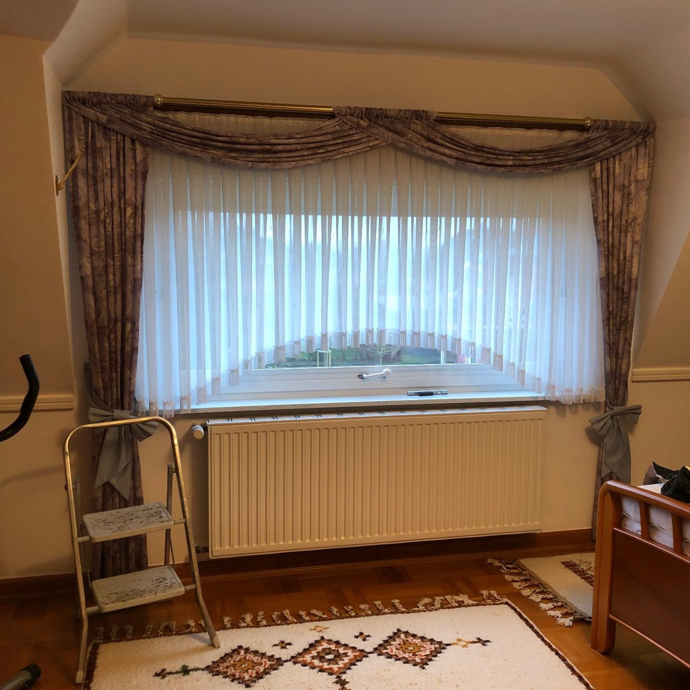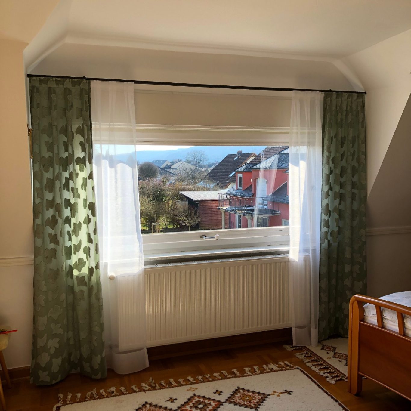 Hier wurde eine Gardinenstange mit zwei Wollfilzfadenvorhängen montiert, und blickdichte Rollos mit einer Bucheabschlußleiste.